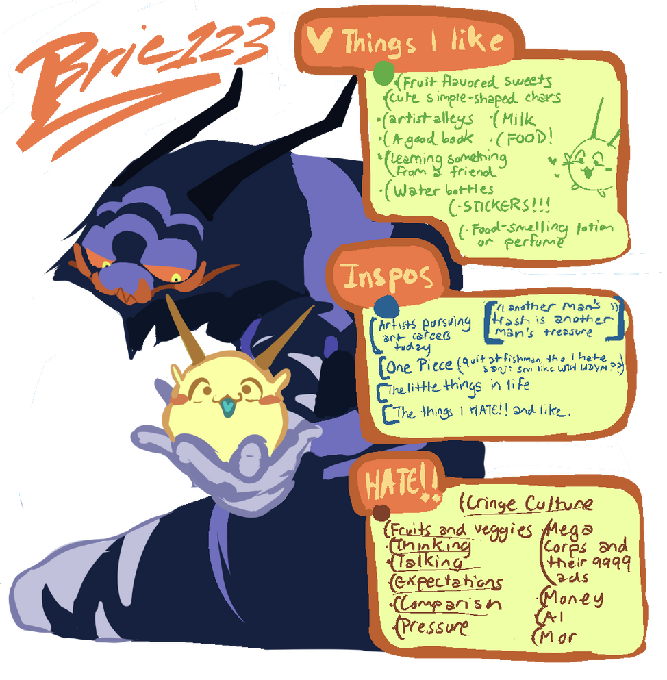 Greetings! I'm Brie, and I use she/her pronouns. As you may have guessed, I'm someone interested in drawing characters--whether it be digitally or traditionally!Something that drew me into character art was discovering that characters could be representations of myself. It's hard to process what happens in life sometimes, so why not make it fun by figuring it out through a character?and something to point out...I'm really shy! So apologies if I sound stiff at times. Social media isn't the healthiest for me either so I may go on random hiatuses.
